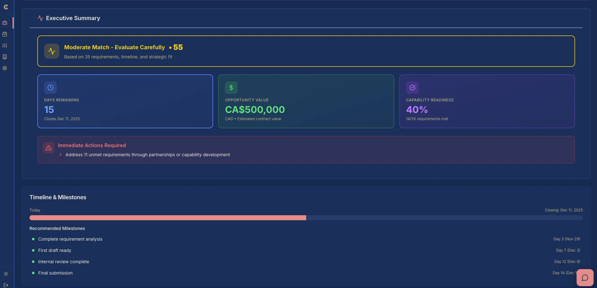 AI matches opportunities to your capabilities and past performance. Never miss a relevant bid again.